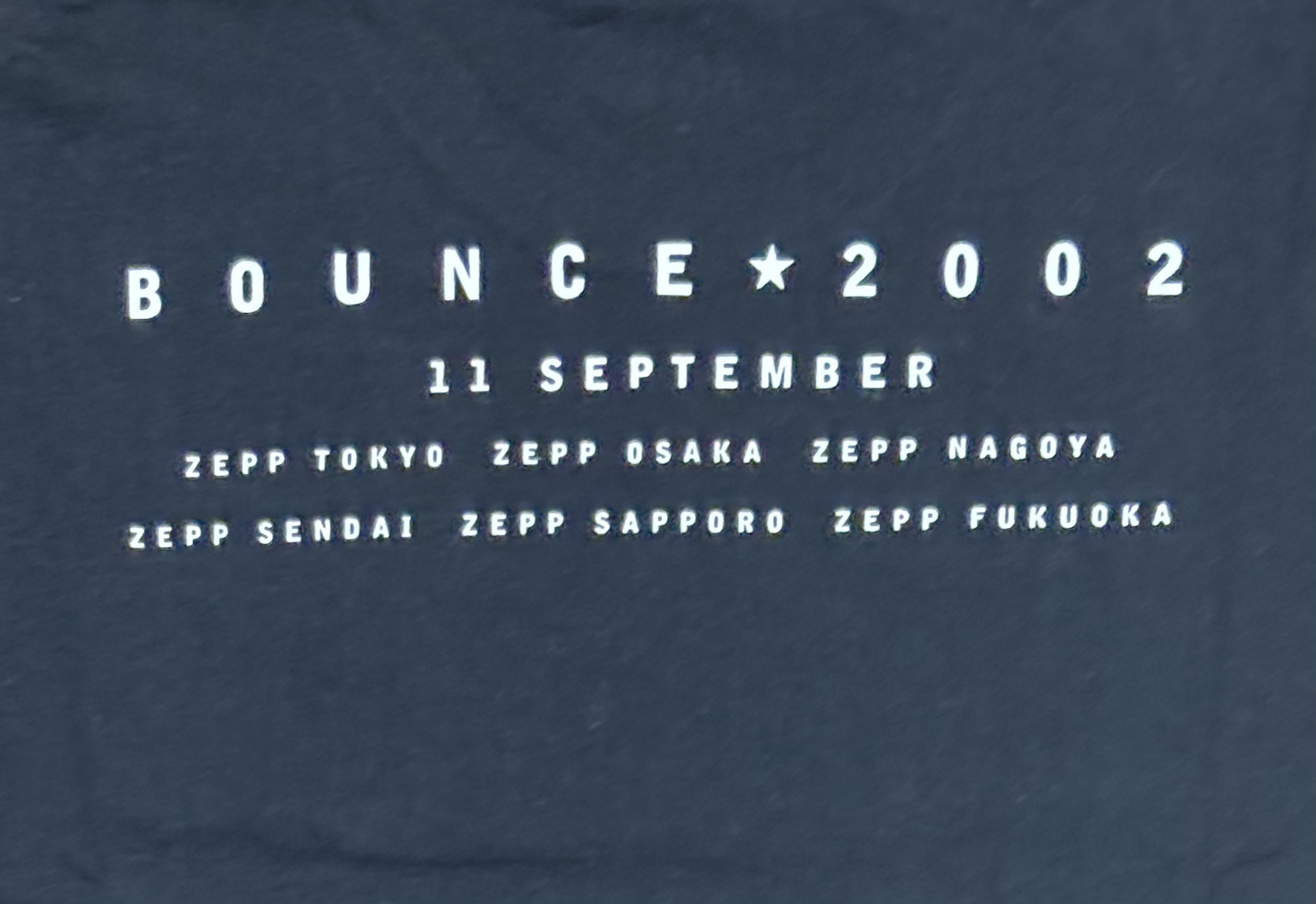 notes : This T-shirt commemorates the invitation-only concert BON JOVI held in TOKYO on September 11, 2002. The concert was broadcast via satellite at ZEPP venues across Japan, and the names of ZEPP venues in each location are printed on the shirt.