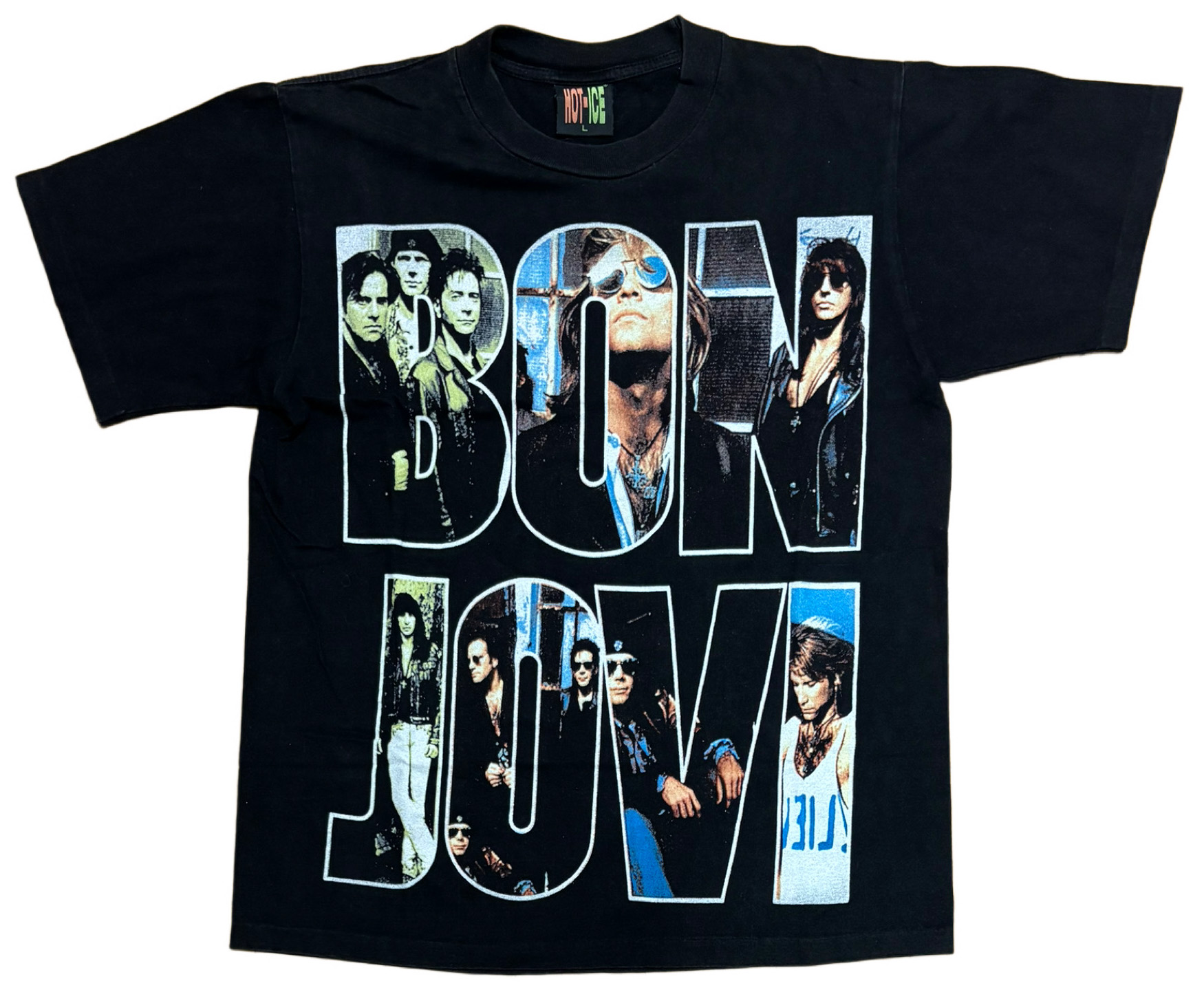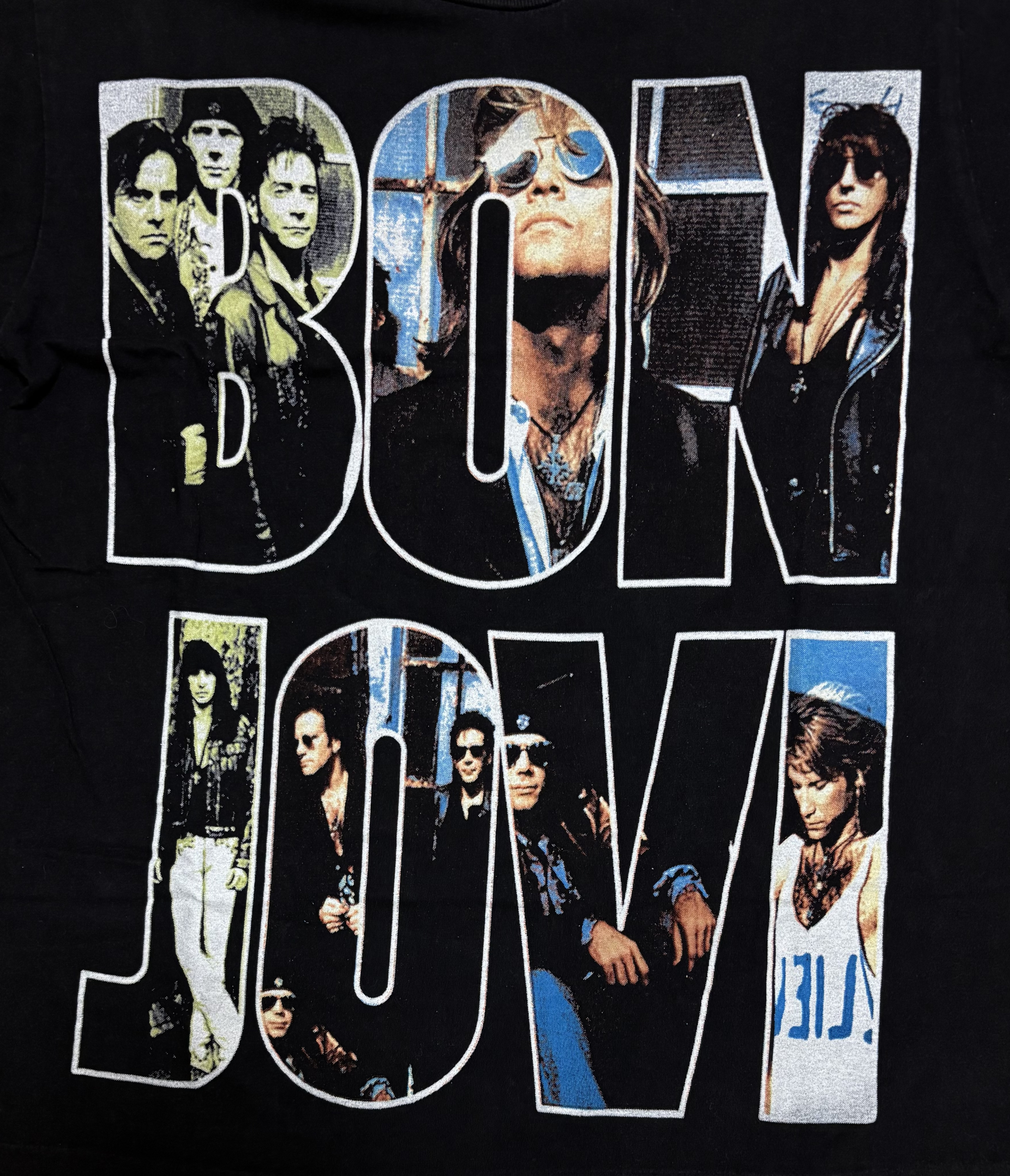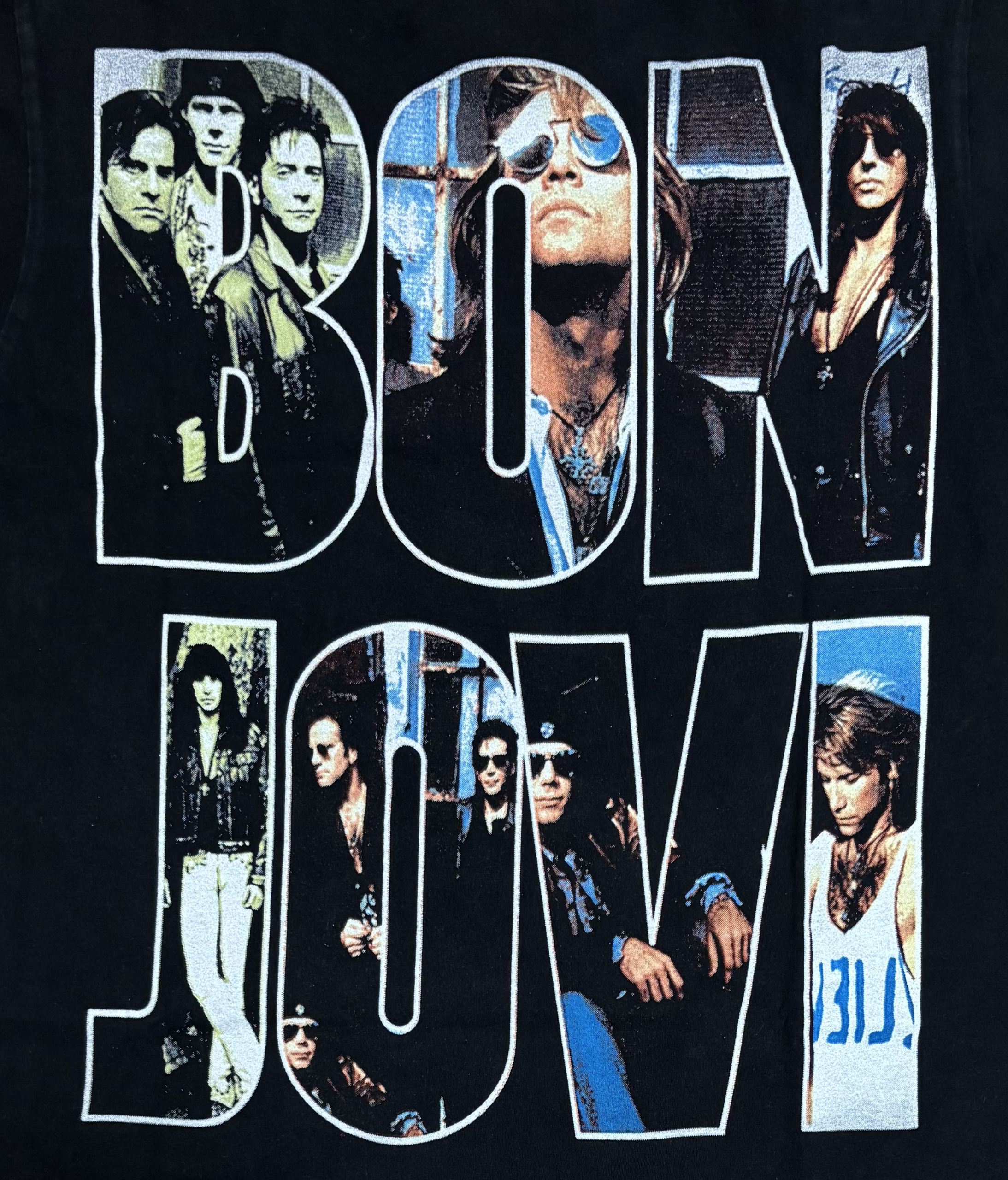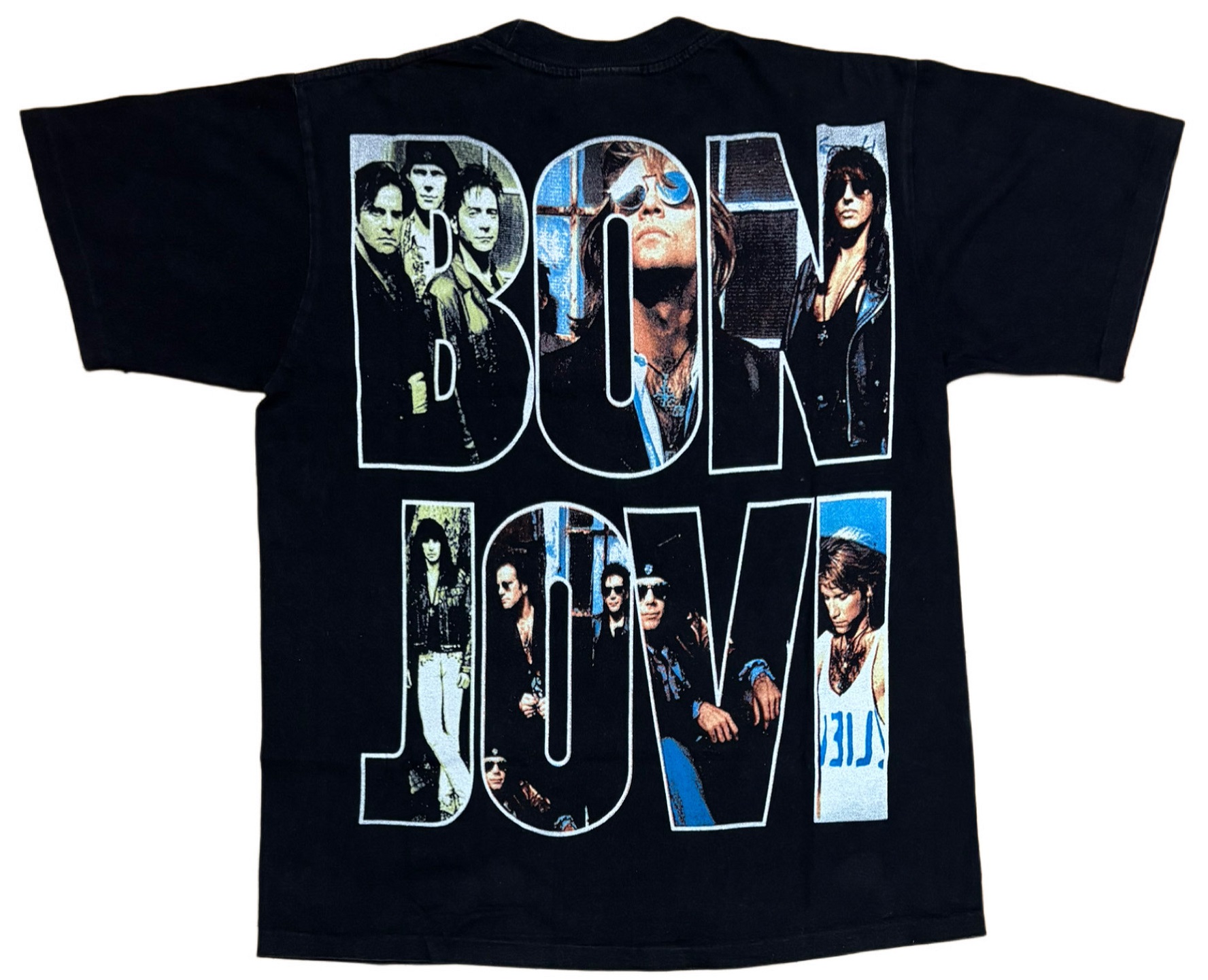 notes : A T-shirt with “BON JOVI" printed on the front and back, featuring photos of BON JOVI’s members from “KEEP THE FAITH" released in 1992.