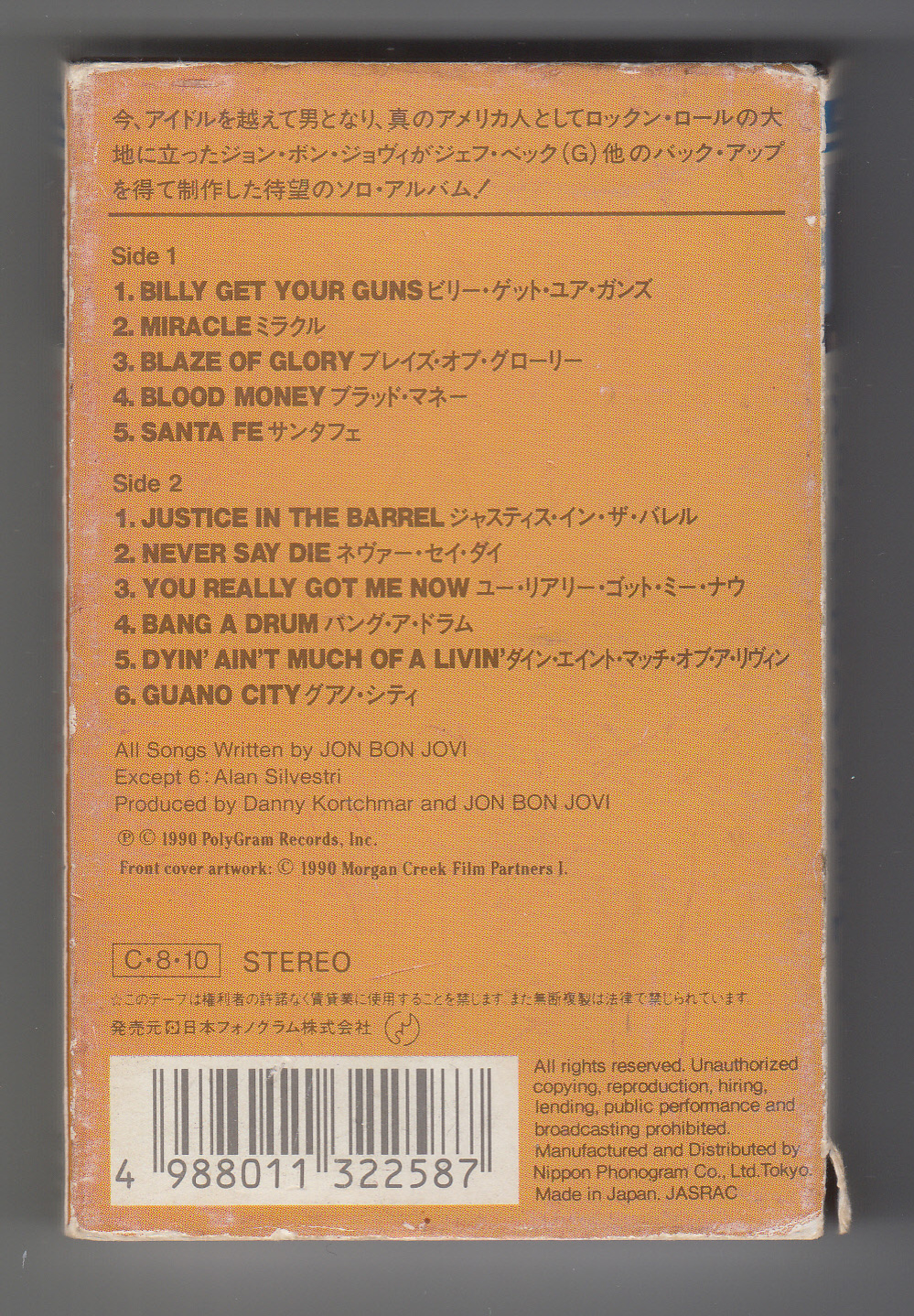 notes : JON BON JOVI album for movie “YOUNG GUNS 2" in 1990. JAPAN cassette tape in slipcase with JON’s card.