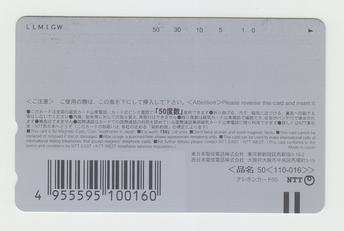 備考 : 2001年日本公演のライブ会場の外で売られていたオフィシャルではないテレホンカード。50度数。カード番号は、自由に印刷ができたホワイトテレホンカードの110-016