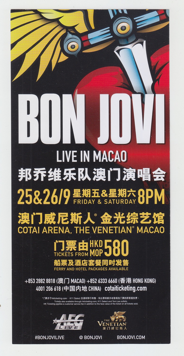 備考 : ボン・ジョヴィが2015年に行なったアジア・中東ツアー(インドネシア、タイ、マレーシア、シンガポール、韓国、マカオ、UAE、イスラエルを巡るも日本ツアーは開催されず)のうち、マカオ公演のフライヤー。両面同じ絵柄