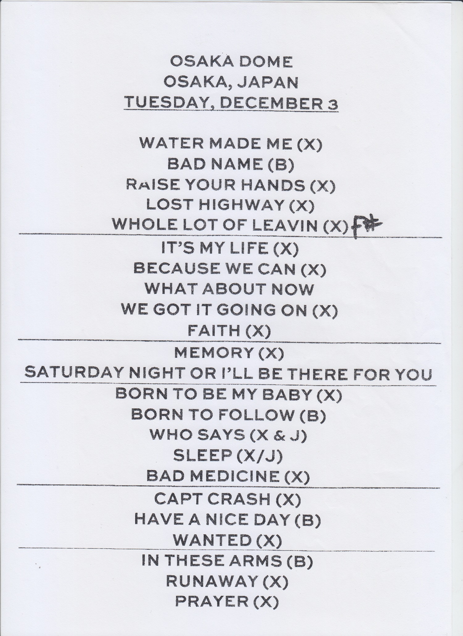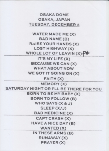 notes : BON JOVI’s setlist for their December 3, 2013 OSAKA DOME concert. Their 2013 JAPAN tour consisted of only one date each in OSAKA and TOKYO.