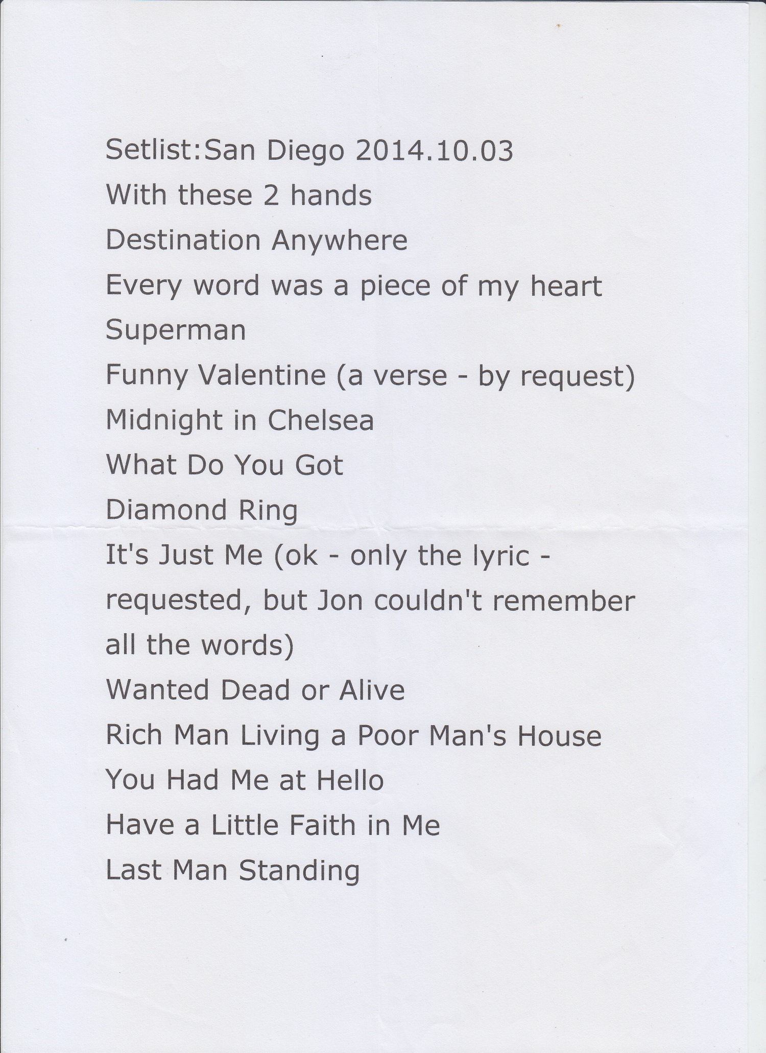 notes : Setlist for JON BON JOVI & KINGS OF SUBURBIA’s performance at the HARD ROCK HOTEL SAN DIEGO on October 3, 2014. This performance was held as part of JON BON JOVI’s fan club trip, RUNAWAY TOURS.