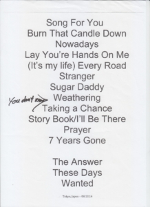 notes : Setlist for RICHIE SAMBORA’s only solo Japan performance on August 13, 2014 from his AFTERMATH OF THE LOWDOWN TOUR.