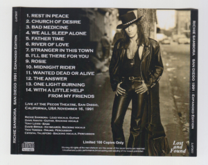 notes : Recorded in San Diego on November 16, 1991, as part of the promotional tour for his solo album “STRANGER IN THIS TOWN." Two songs that were not broadcast on the radio (Rest In Peace, River Of Love) have been added as audience recordings. “We All Sleep Alone" was co-written by JON BON JOVI, RICHIE SAMBORA, and DESMOND CHILD and was featured on CHER’s 1988 album “CHER." Limited to 100 copies.