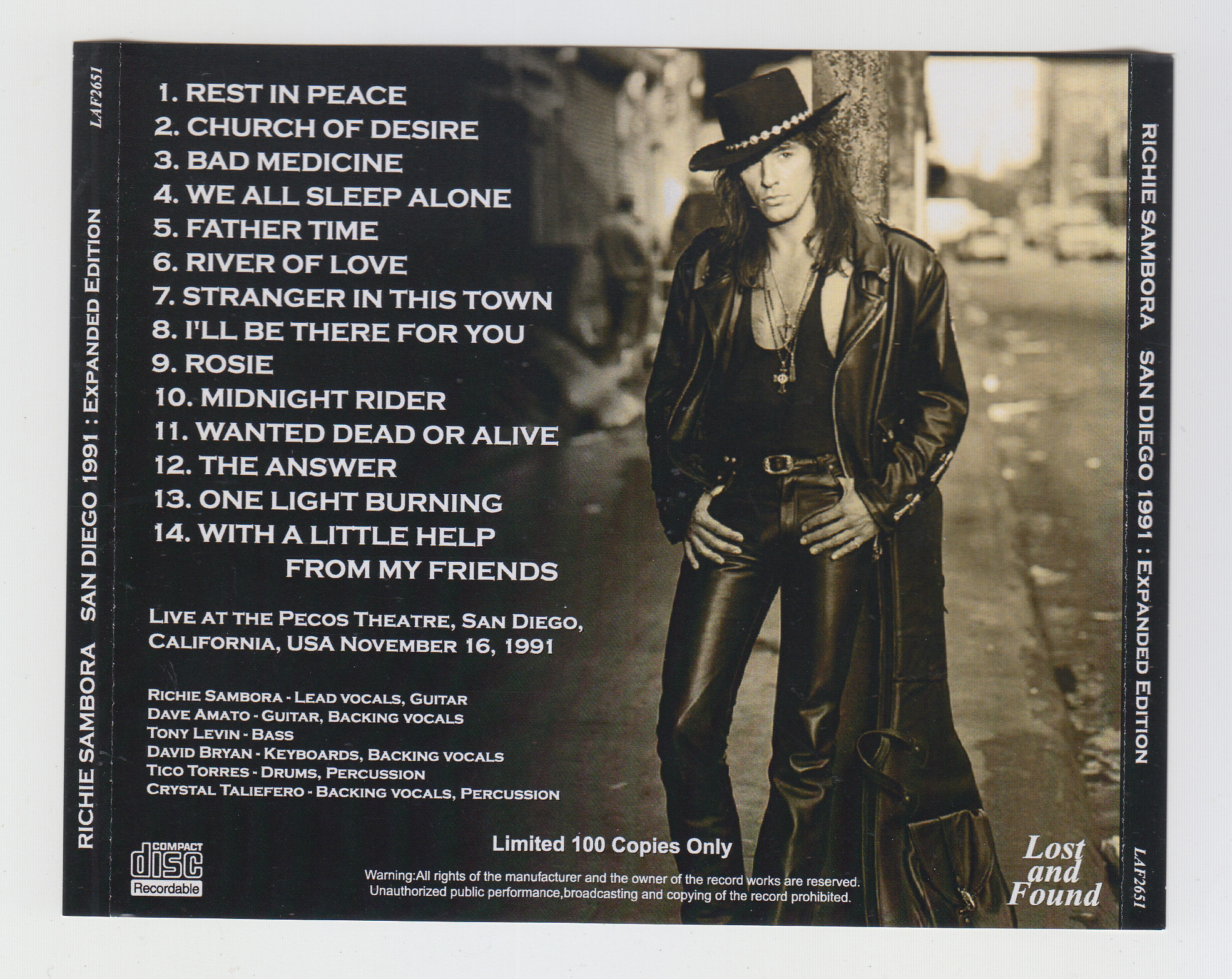 備考 : ソロアルバム"STRANGER IN THIS TOWN"のプロモーションツアーとして行なわれた1991年11月16日サンディエゴでの公演を収録。ラジオでも放送された音源に放送されなかった2曲(Rest In Peace, River Of Love)をオーディエンス録音音源で追加。We All Sleep Aloneはジョン・ボン・ジョヴィ、リッチー・サンボラ、デズモンド・チャイルドの共作で、シェールの1988年のアルバム"CHER"に提供された曲。100枚限定盤