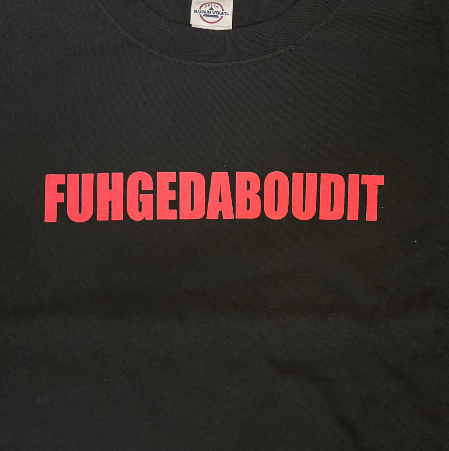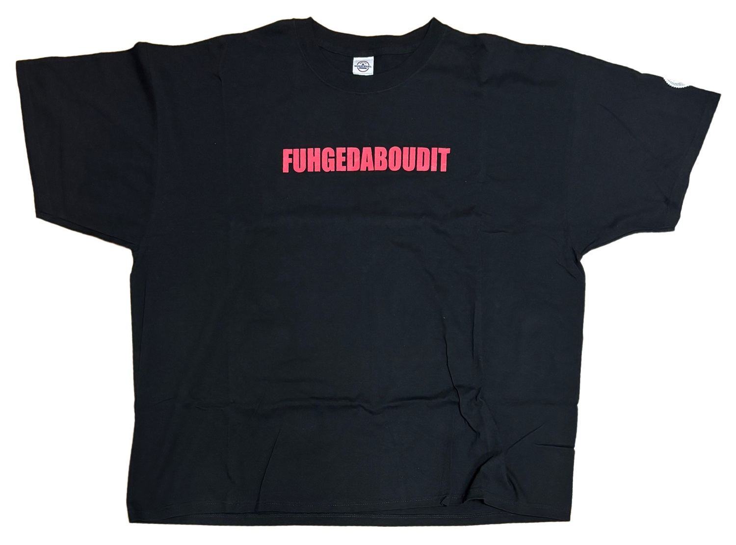 備考 : ボン・ジョヴィのBOUNCE ツアー。2003年2月10・11日ニュージャージー公演Tシャツ。胸プリントの"FUHGEDDABOUDIT"は"forget about it"をつなげたスラングで、"そんなものは忘れてしまえ"という意味