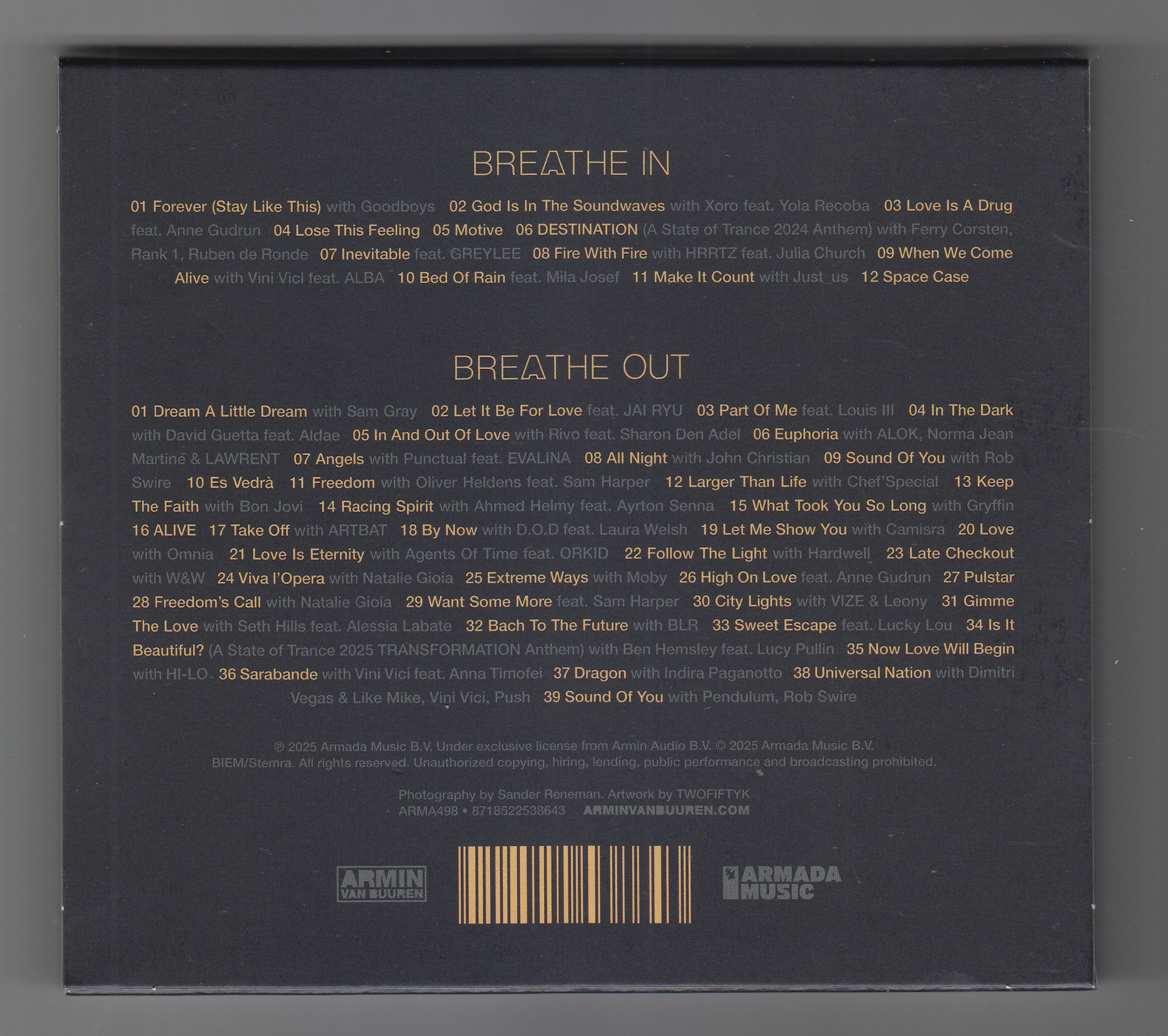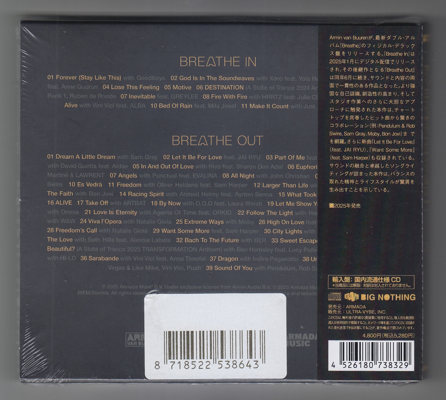 notes : This album by ARMIN VAN BUUREN, the world-famous Dutch DJ. It’s a physical CD release of “BREATHE IN," released digitally in January 2025, and “BREATHE OUT," released in June, with an additional disc. “BREATHE OUT" includes “Keep The Faith," a collaboration with BON JOVI. This import edition includes a Japanese obi strip and is available for domestic distribution.
