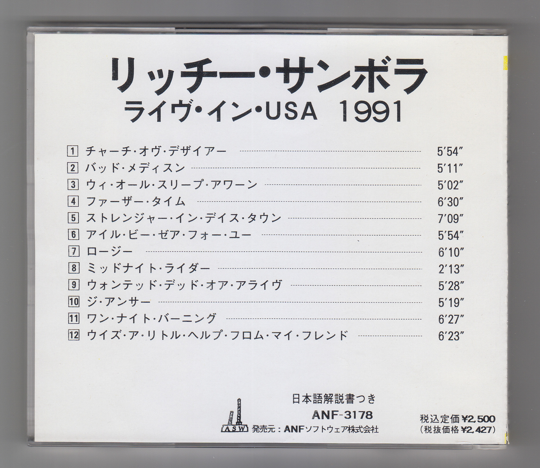 備考 : ソロアルバム"STRANGER IN THIS TOWN"のプロモーションツアーとして行なわれた1991年11月16日サンディエゴでの公演を収録。ラジオでも放送された音源。We All Sleep Aloneはジョン・ボン・ジョヴィ、リッチー・サンボラ、デズモンド・チャイルドの共作で、シェールの1988年のアルバム"CHER"に提供された曲。日本語帯・解説書付き