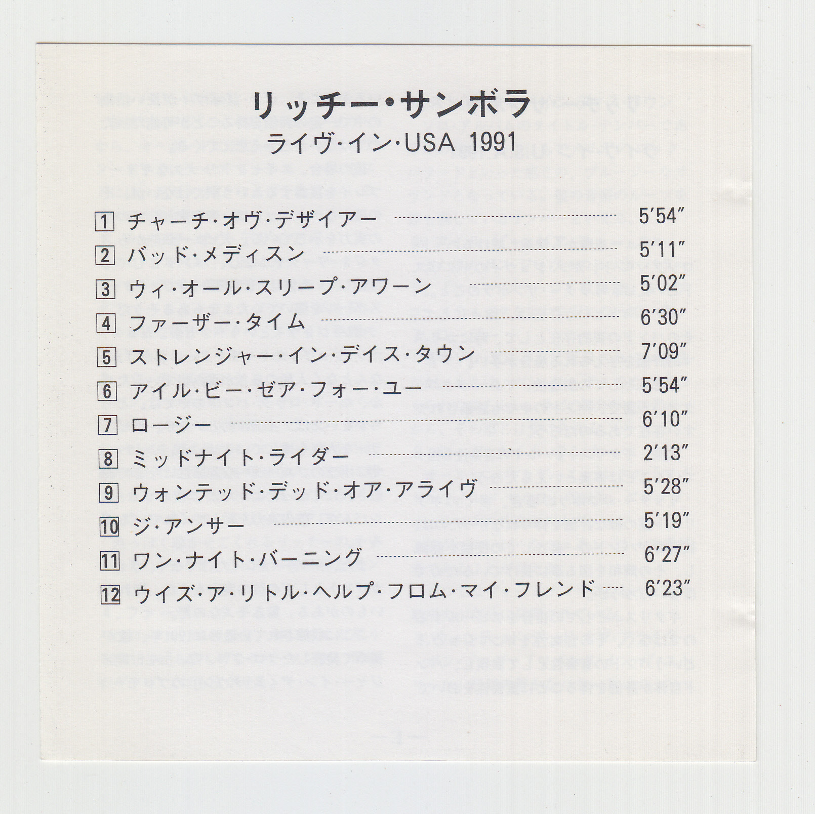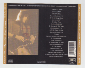 notes : Recorded in San Diego on November 16, 1991, as part of the promotional tour for his solo album “STRANGER IN THIS TOWN." This recording was also broadcast on radio. “We All Sleep Alone" was co-written by JON BON JOVI, RICHIE SAMBORA, and DESMOND CHILD and was featured on CHER’s 1988 album “CHER." Comes with Japanese obi and commentary booklet.