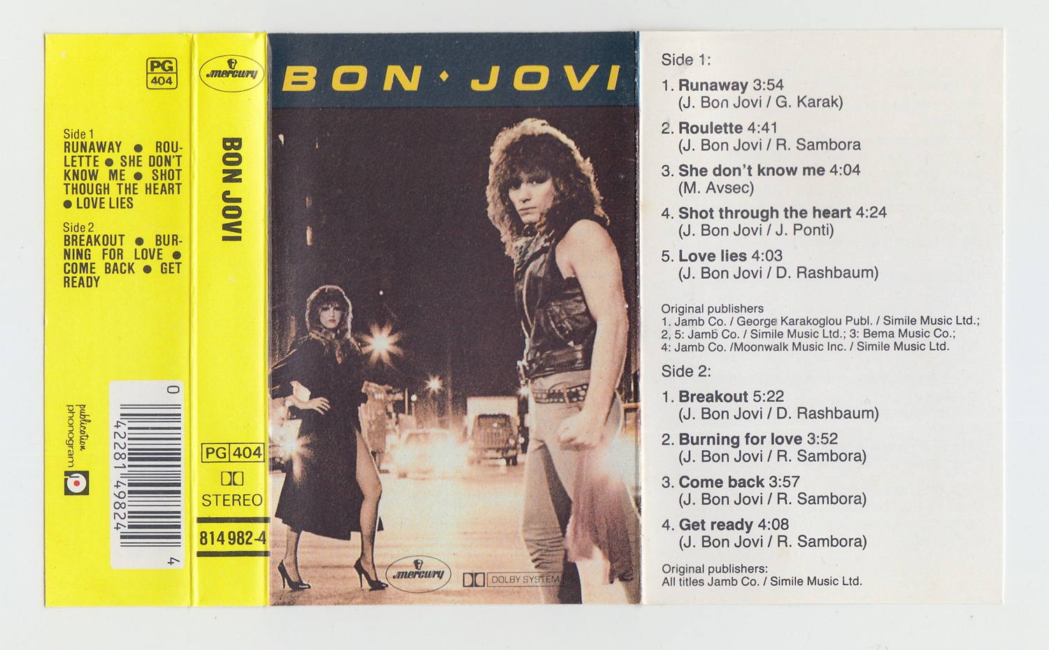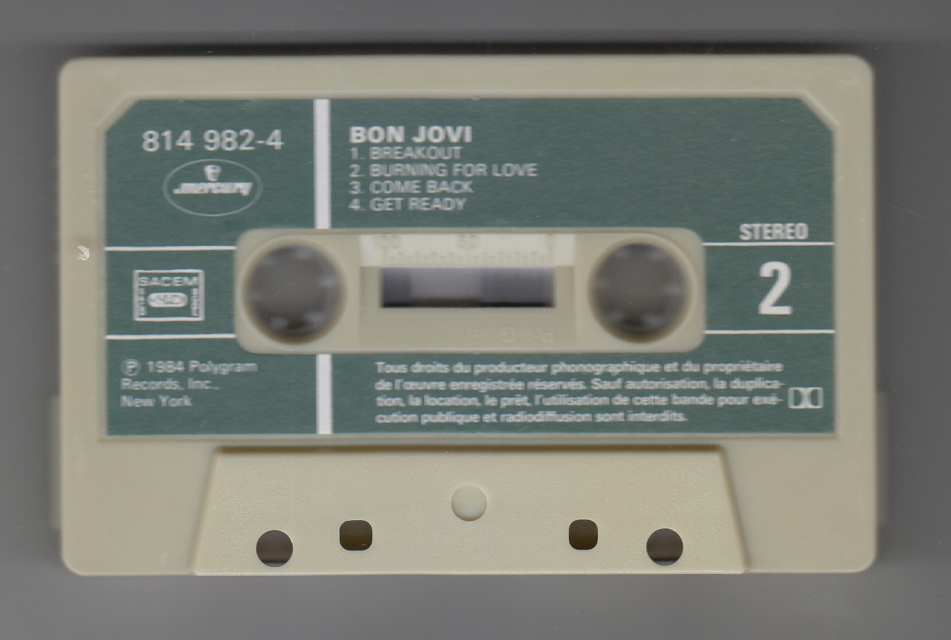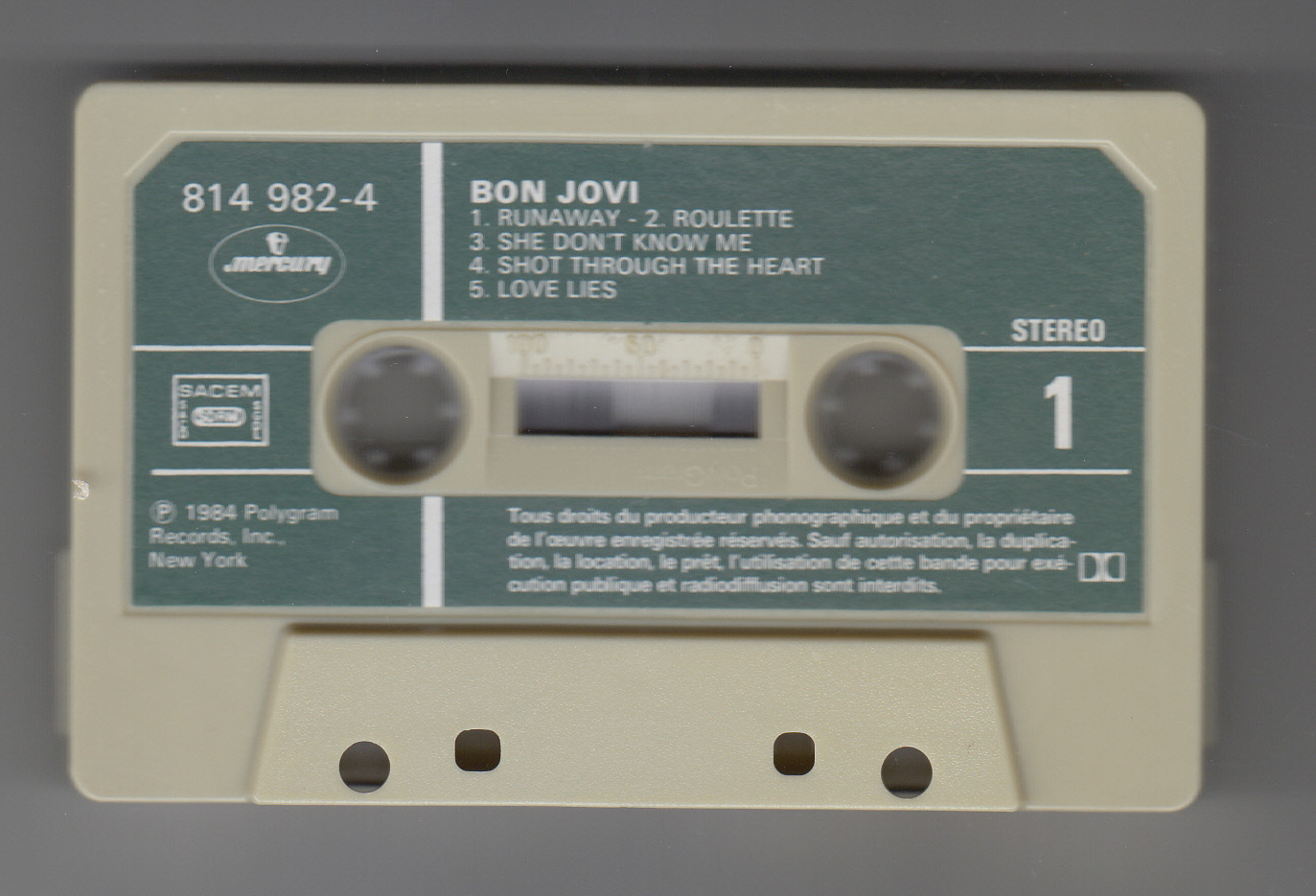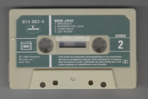 備考 : 1984年発表のファーストアルバム。フランス盤カセット。ジャケットのジョン・ボン・ジョヴィが大きくなるようにトリミングされ、背は黄色。テープは緑色のシールが貼られているのが特徴