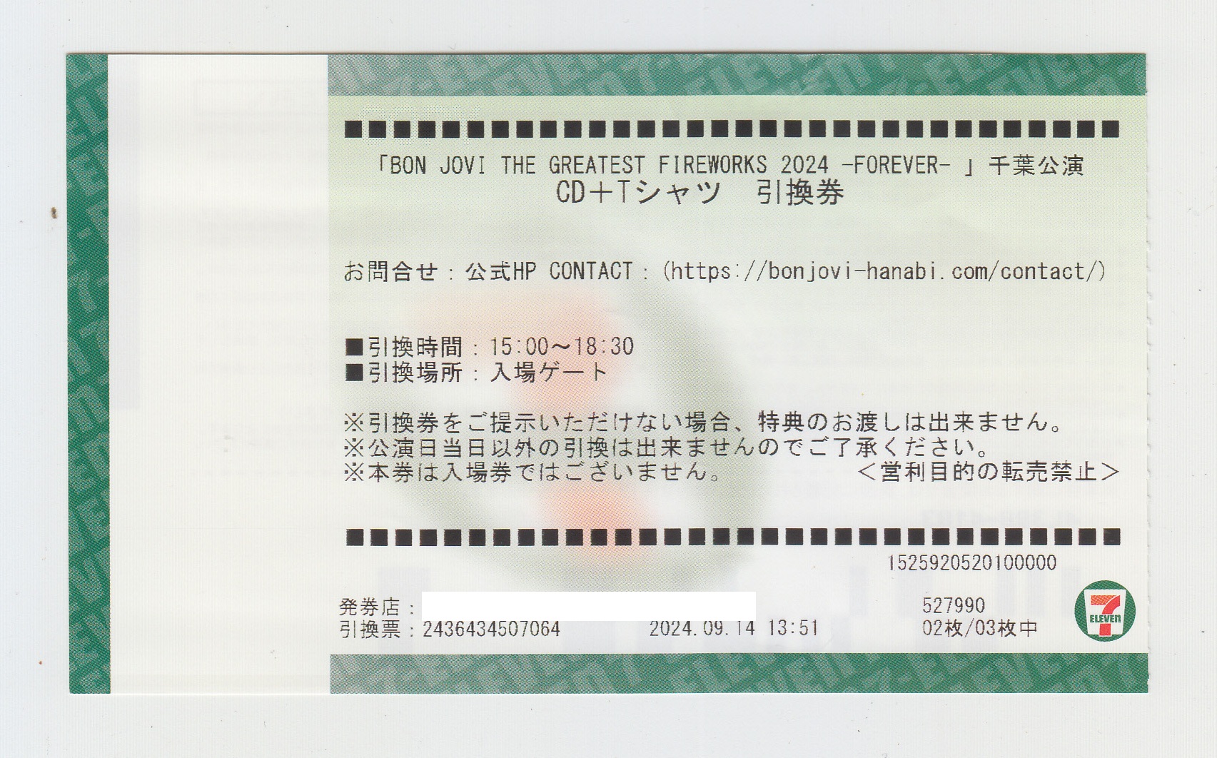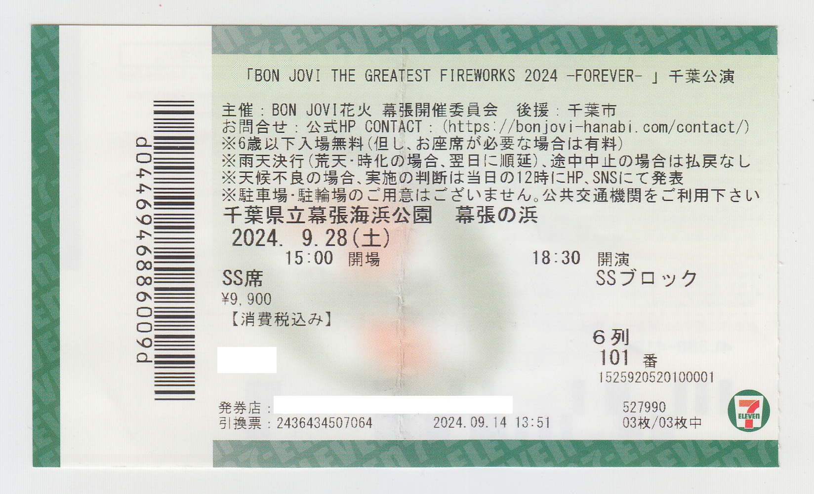 notes : Fireworks festival held in Chiba and Miyazaki prefectures in JAPAN in 2024. Tickets for the Chiba fireworks. The fireworks were set to the music of BON JOVI. The first ticket was a premium ticket with merchandise including a CD and a T-shirt (the second ticket was a voucher for the CD and T-shirt). The third ticket was a regular ticket.