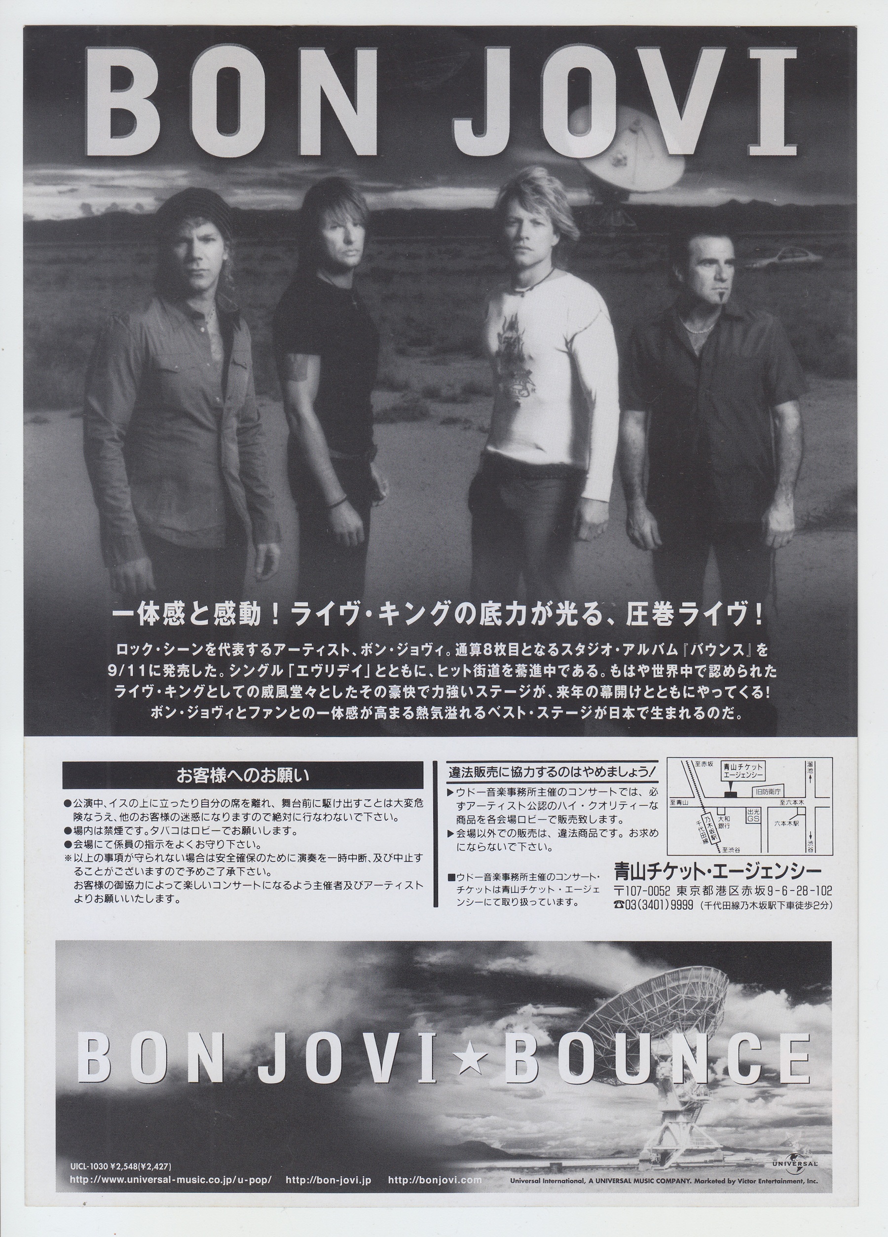 備考 : ボン・ジョヴィの2003年来日公演、東京ドーム公演告知フライヤー。1月17日・19日公演のソールドアウトを受け、残席がわずかに残った1月16日公演用に制作された