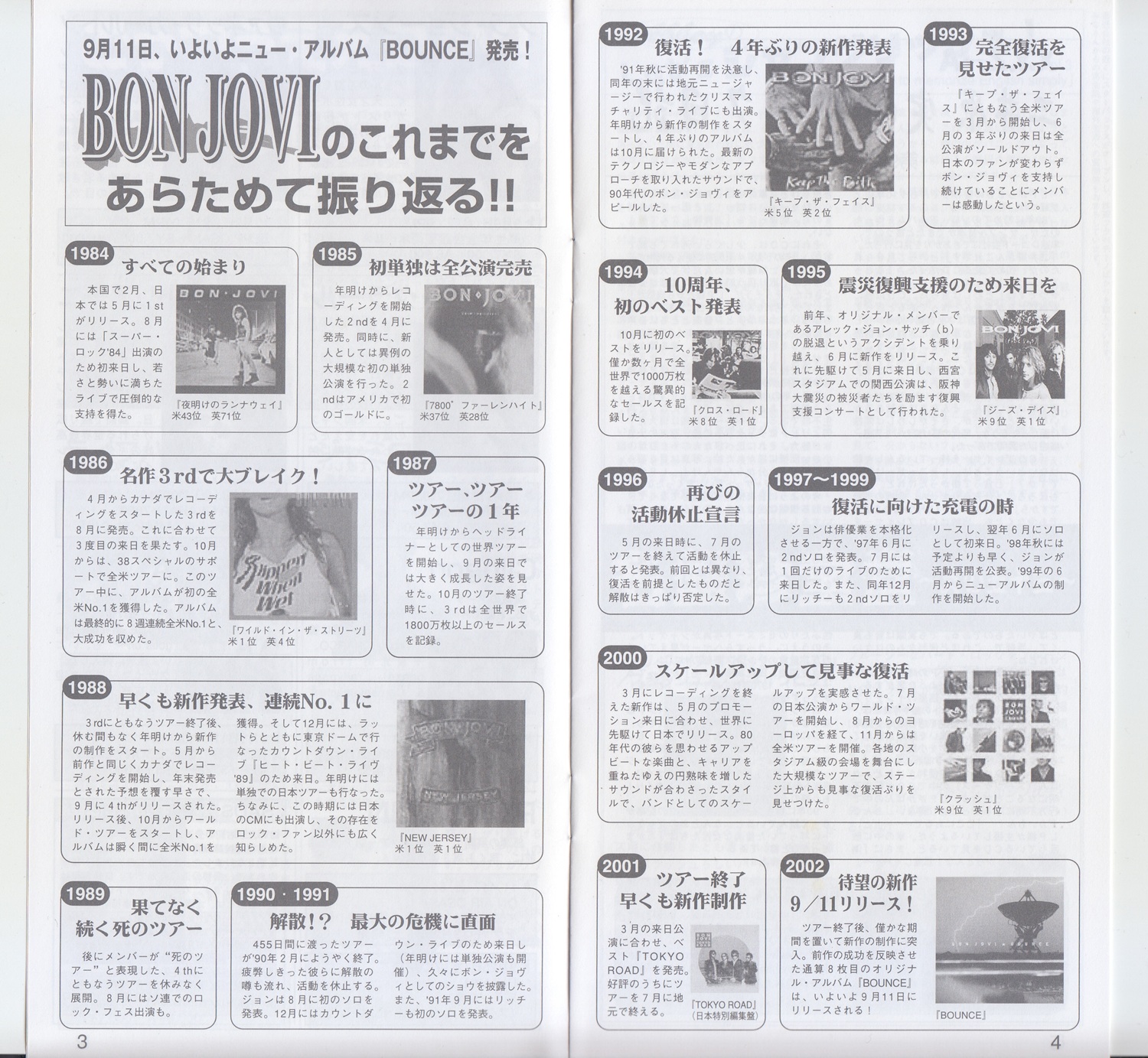 notes : This is a newsletter distributed to members by Udo Osaka, the Osaka branch of Udo Artists, a Japanese promoter. It includes articles looking back at BON JOVI’s history leading up to the release of their 2002 album “BOUNCE," and an article showcasing past Japan tour setlists, specifically those from 1995 and 2001.