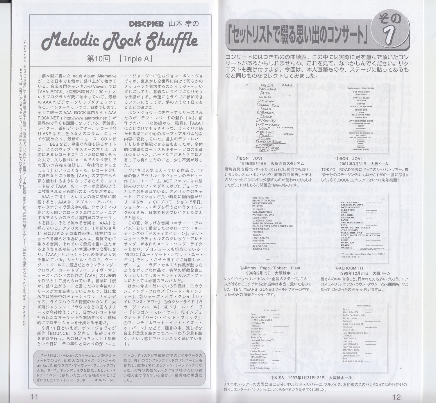 備考 : 日本のプロモーター、ウドー音楽事務所の大阪地区担当、ウドー大阪が会員向けに配布していた会報誌。2002年のアルバム"BOUNCE"リリースに向けてそれまでのボン・ジョヴィの歴史を振り返る記事、過去の日本公演セットリストを紹介する記事ではボン・ジョヴィの1995年・2001年セットリストが紹介されている