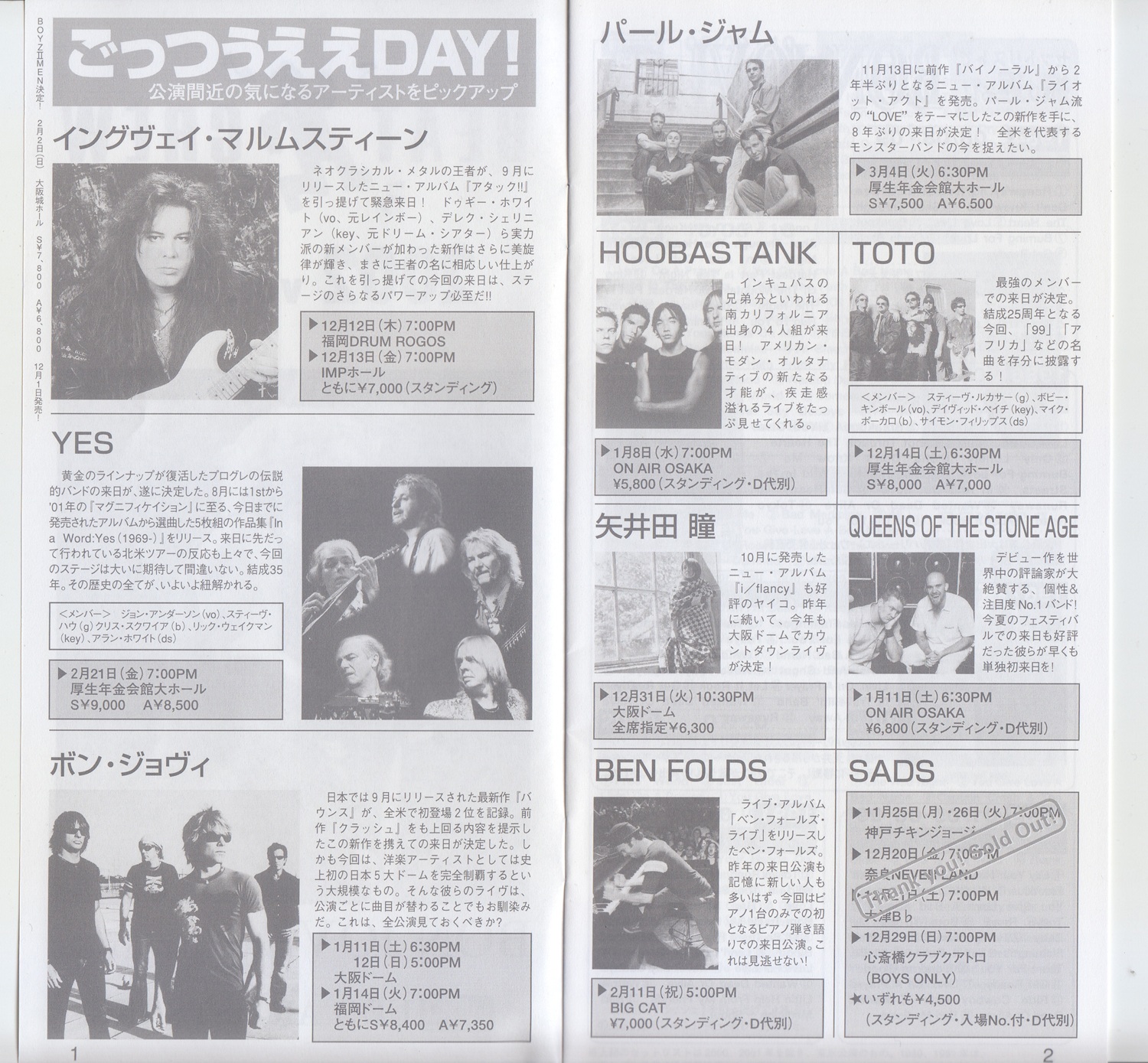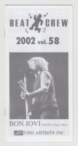 notes : This is a newsletter distributed to members by Udo Osaka, the Osaka branch of Udo Artists, a Japanese promoter. It contains information on BON JOVI’s January 2003 Japan tour (Osaka and Fukuoka performances) and setlists from BON JOVI’s Osaka and Hyogo performances held from 1984 to 2001.