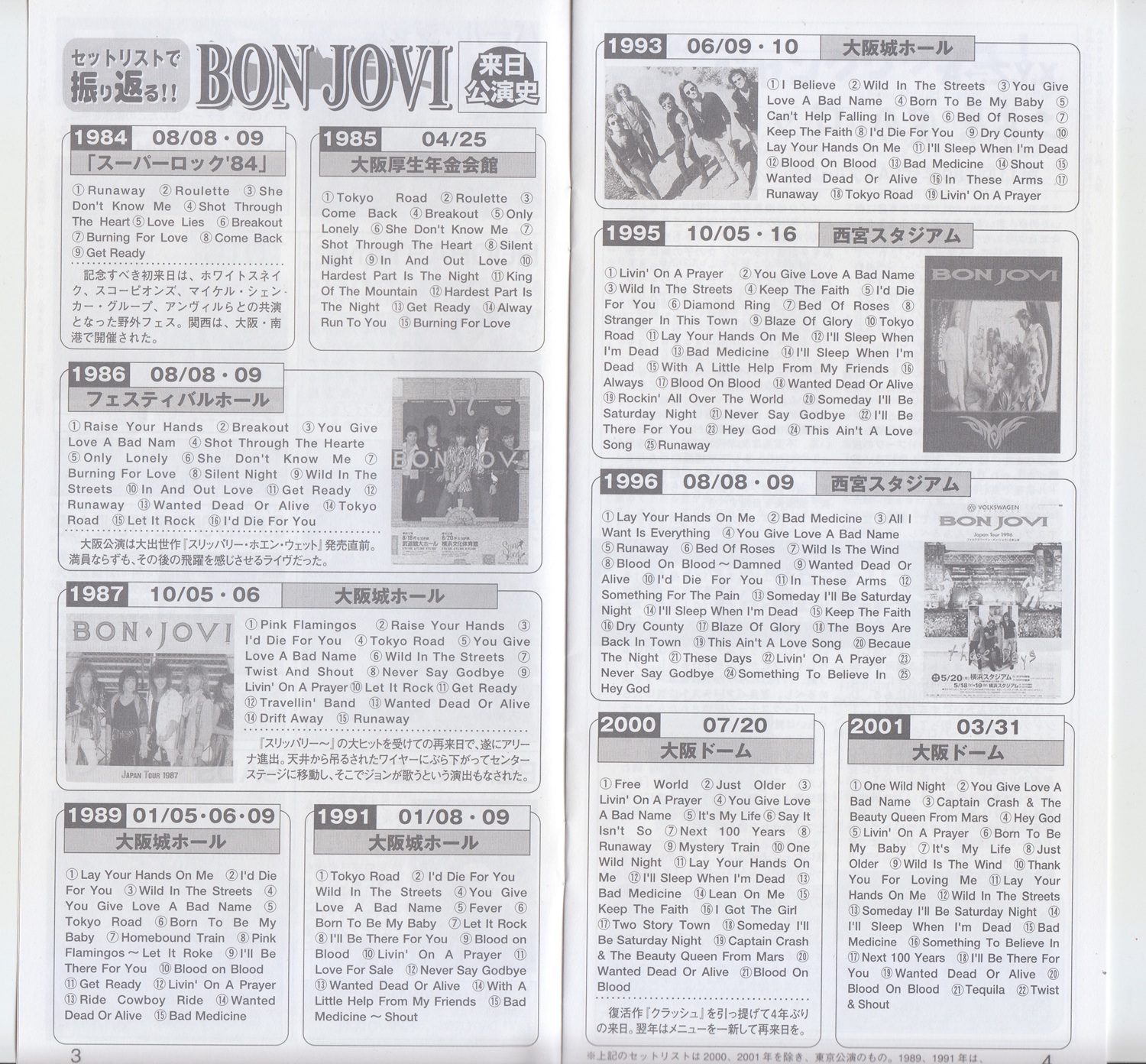 BON JOVI article : Live information (2003.1.11,12 OSAKA, 2003.1.14 FUKUOKA), 1984-2002 Japan Tour setlist history