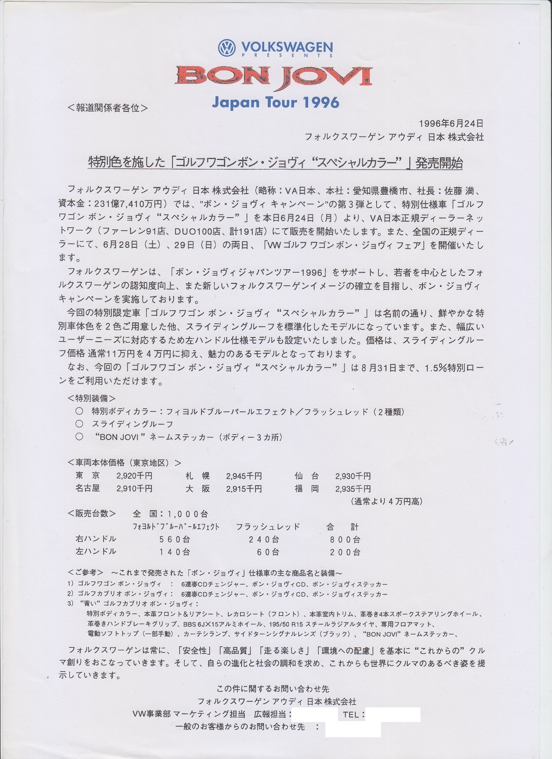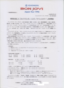 notes : BON JOVI Car was released from VOLKSWAGEN who sponsored the 1996 JAPAN tour. A flyer announcing its release of Golf Wagon BON JOVI SPECIAL COLOR (Golf Wagon Bon Jovi Special Color). Golf Wagon BON JOVI SPECIAL COLOR was released nationwide limited to 1,000 units. With press release distributed to media representatives.